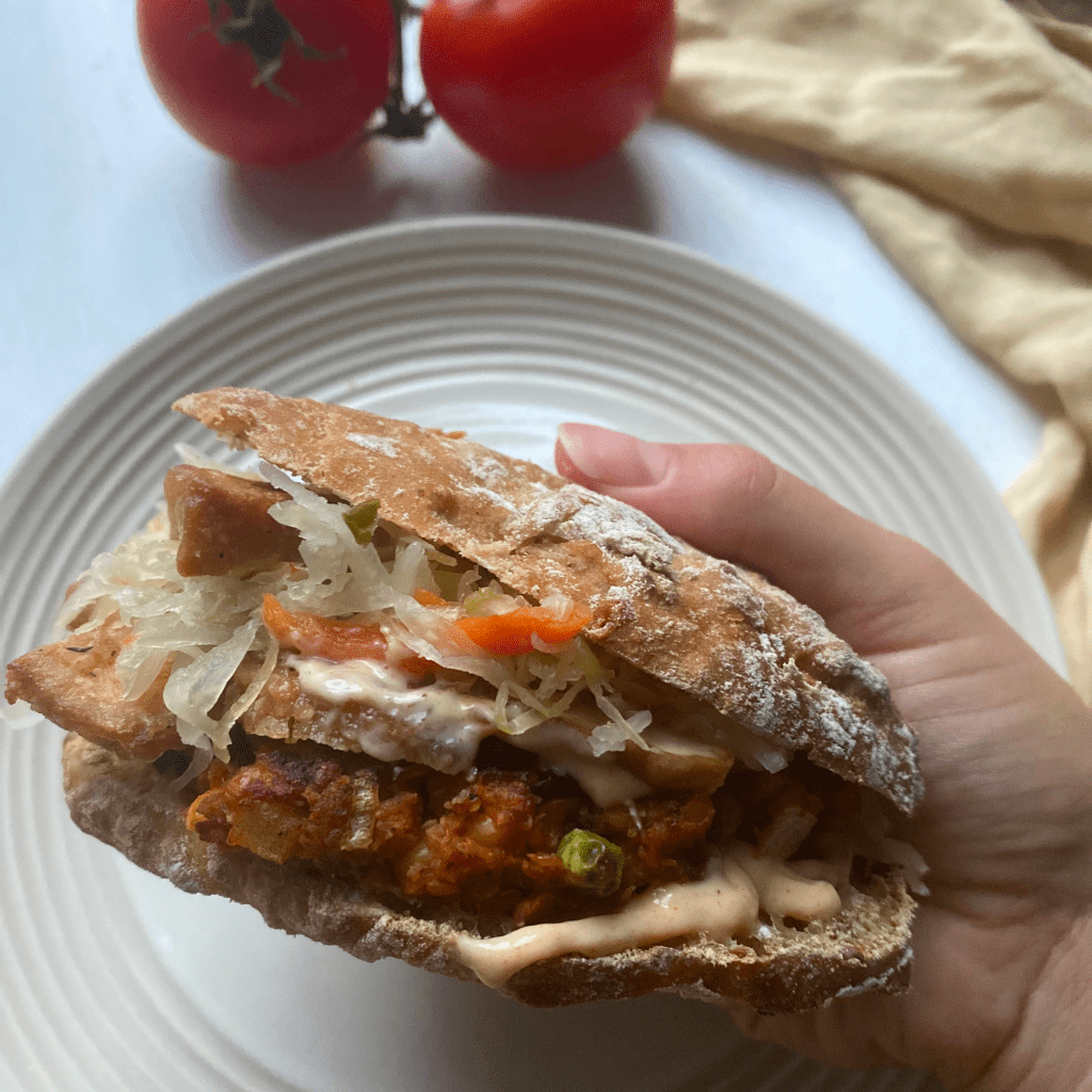 I served these burgers with a quick pink coleslaw: mix together some shredded red cabbage (1/4 of a head), 3-4 tbsp vegan mayo, 1 tsp apple cider vinegar, a chopped spring onion, squeeze of lemon and sprinkle of pumpkin seeds.