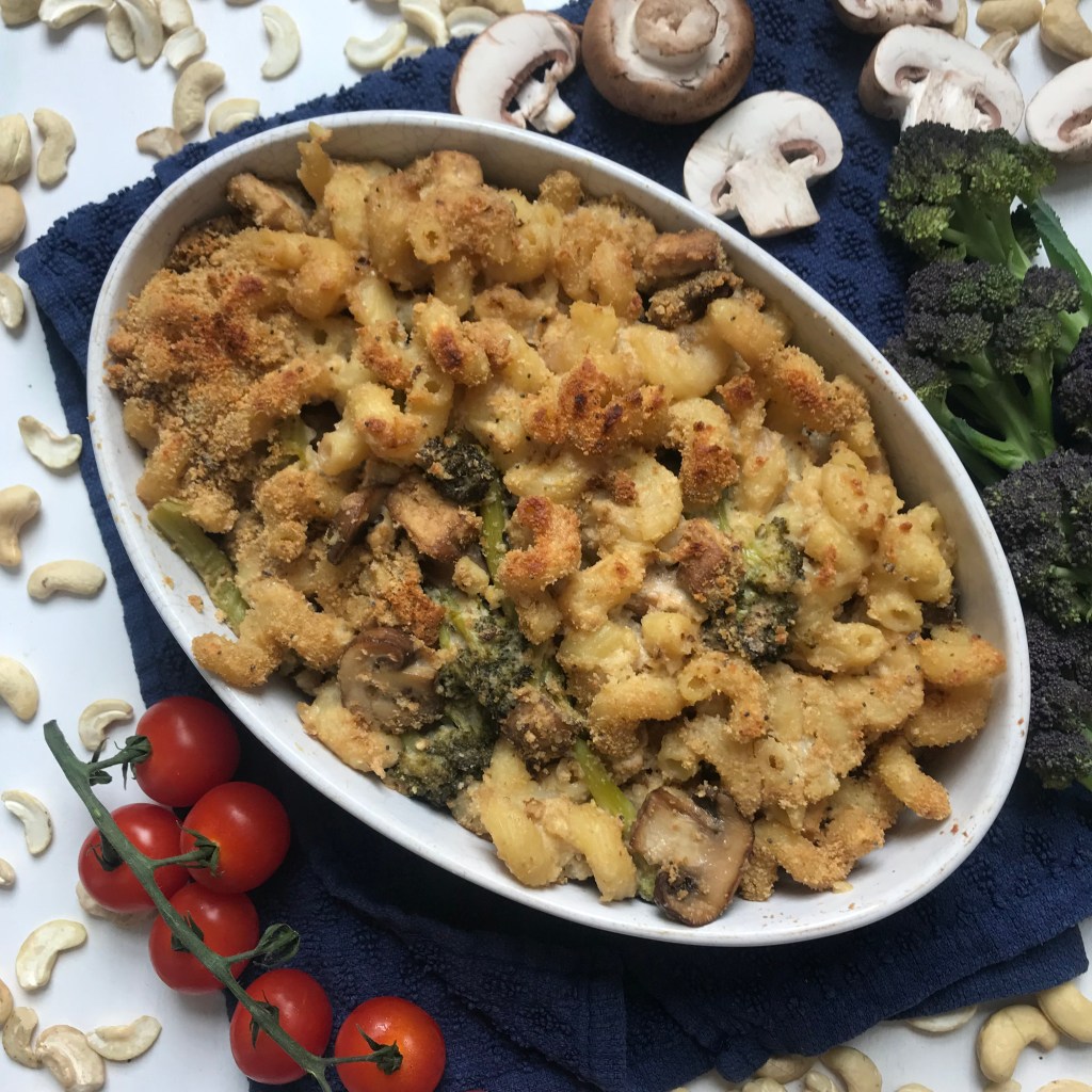 - Once the garlic and onion have softened, pop into a blender (or jug if using hand blender) and blend together with the drained cashews, non-dairy milk, mustard, apple cider vinegar, 5 tbsp of nutritional yeast, a generous pinch of salt and crack of pepper and the tapioca starch.